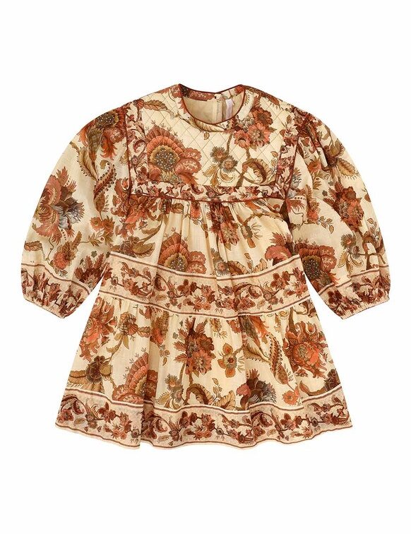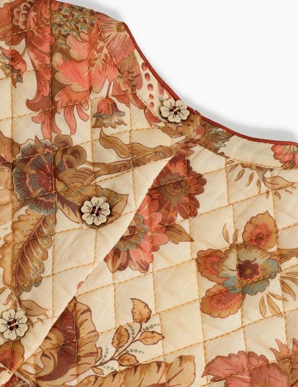 Aster Kids Quilted Dress i Cream Jacobean från vår Summer Swim 2026-kollektion. En bomullsklänning för barn med hög rund halsringning, långa, böljande ärmar, quiltade detaljer på fram- och bakstycket samt en utställd kjol.