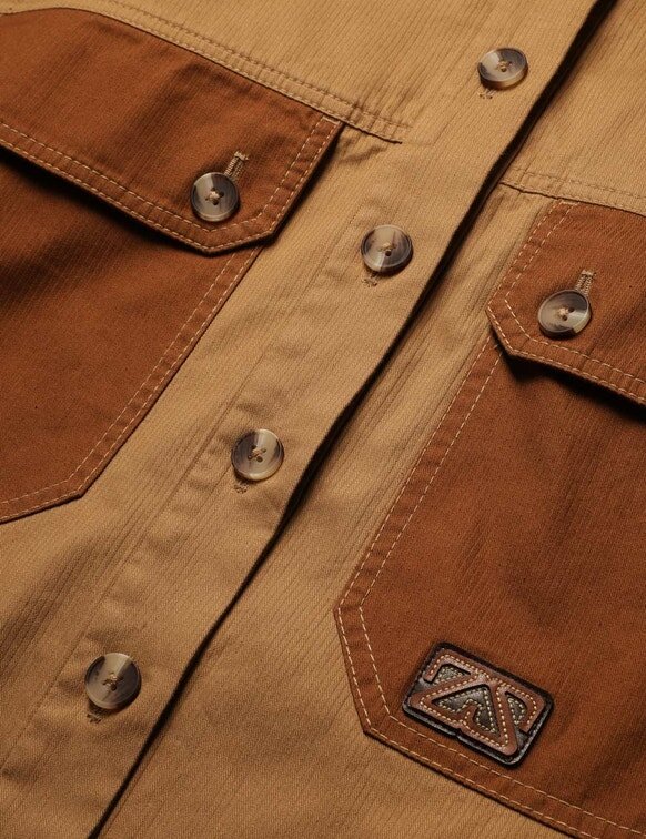 En bomullsskjorta med klassisk krage, påsydda fickor fram, knappar mitt fram, avslutad med remmar vid axlarna och en asymmetrisk fåll.