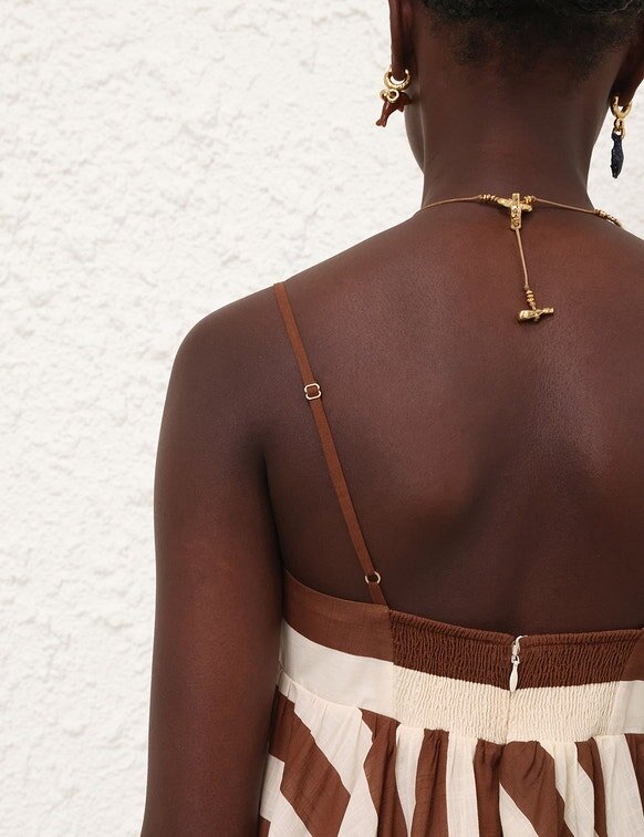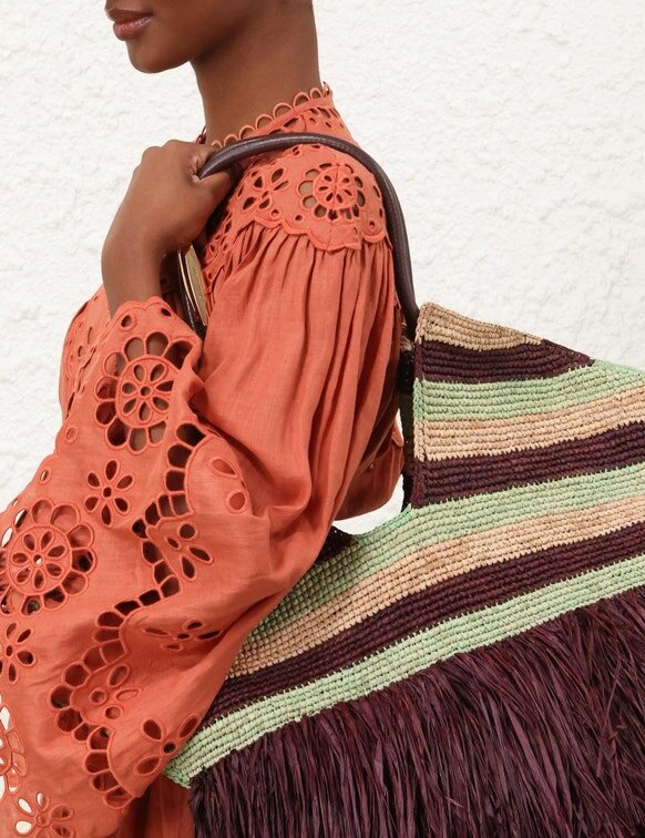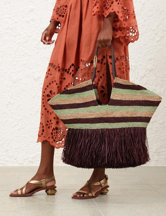 Goldentime är handvävd i raffia och den perfekta sommarvännen: dess silhuett är inspirerad av surfvärlden och havets organiska former, medan det oändliga rörformade handtaget är prytt med surfbrädeinspirerade detaljer. Goldentime är kantad med lekfulla, handskurna fransar av naturlig raffia och rymmer alla sommarens nödvändigheter för att smidigt ta dig från stranden till stan.